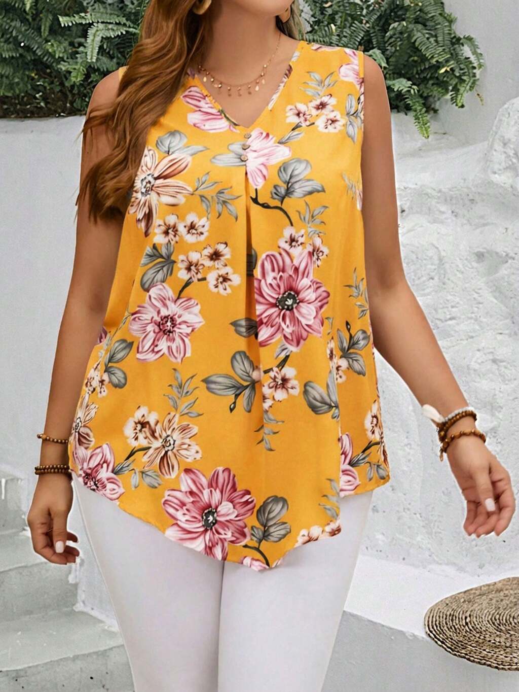 Débardeur à col V imprimé floral pour femmes grandes tailles, pour le printemps