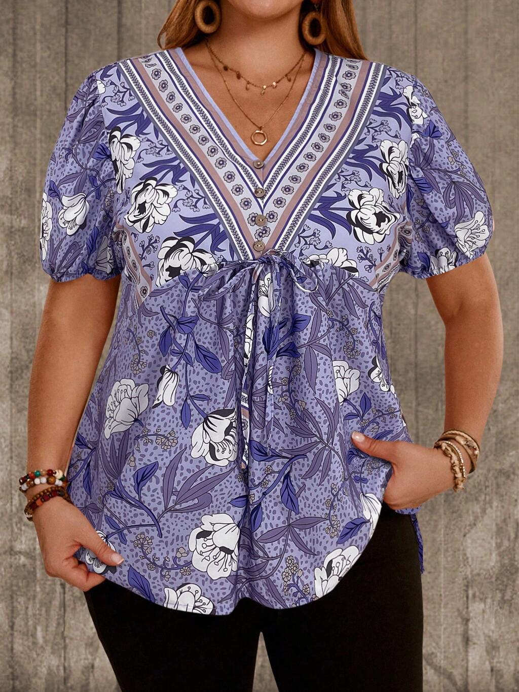 Chemise décontractée ample à col en V, manches courtes, imprimé floral avec nœud devant, grande taille