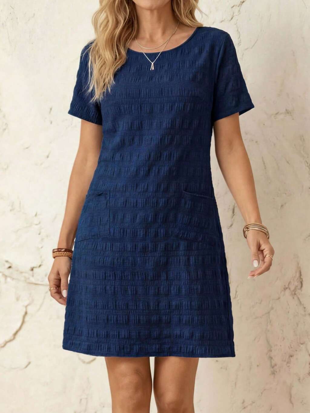 Robe casual brodée à col rond avec manches courtes et poches pour femmes