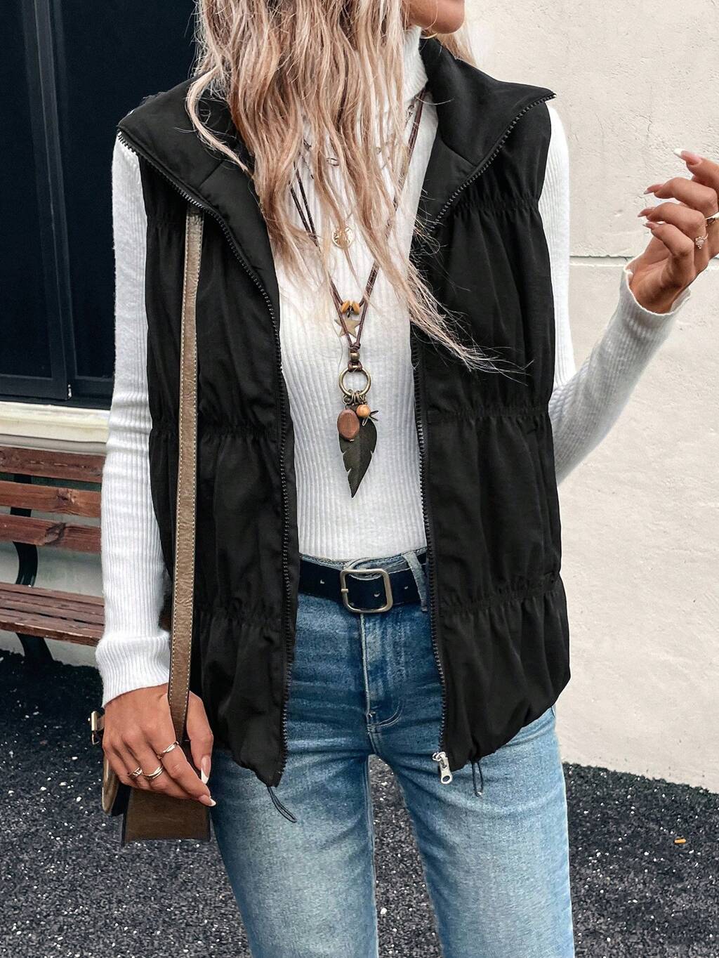 Cappotto imbottito smanicato con chiusura lampo casual monocolore da donna