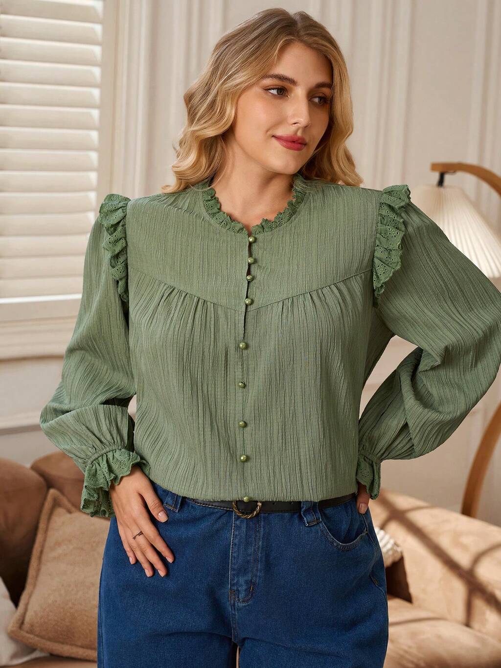 Camicetta elegante e alla moda da donna taglie forti, con stampa ricamata in rete, collo rotondo, maniche lunghe, stile country, adatta per concerti country e l'autunno/inverno