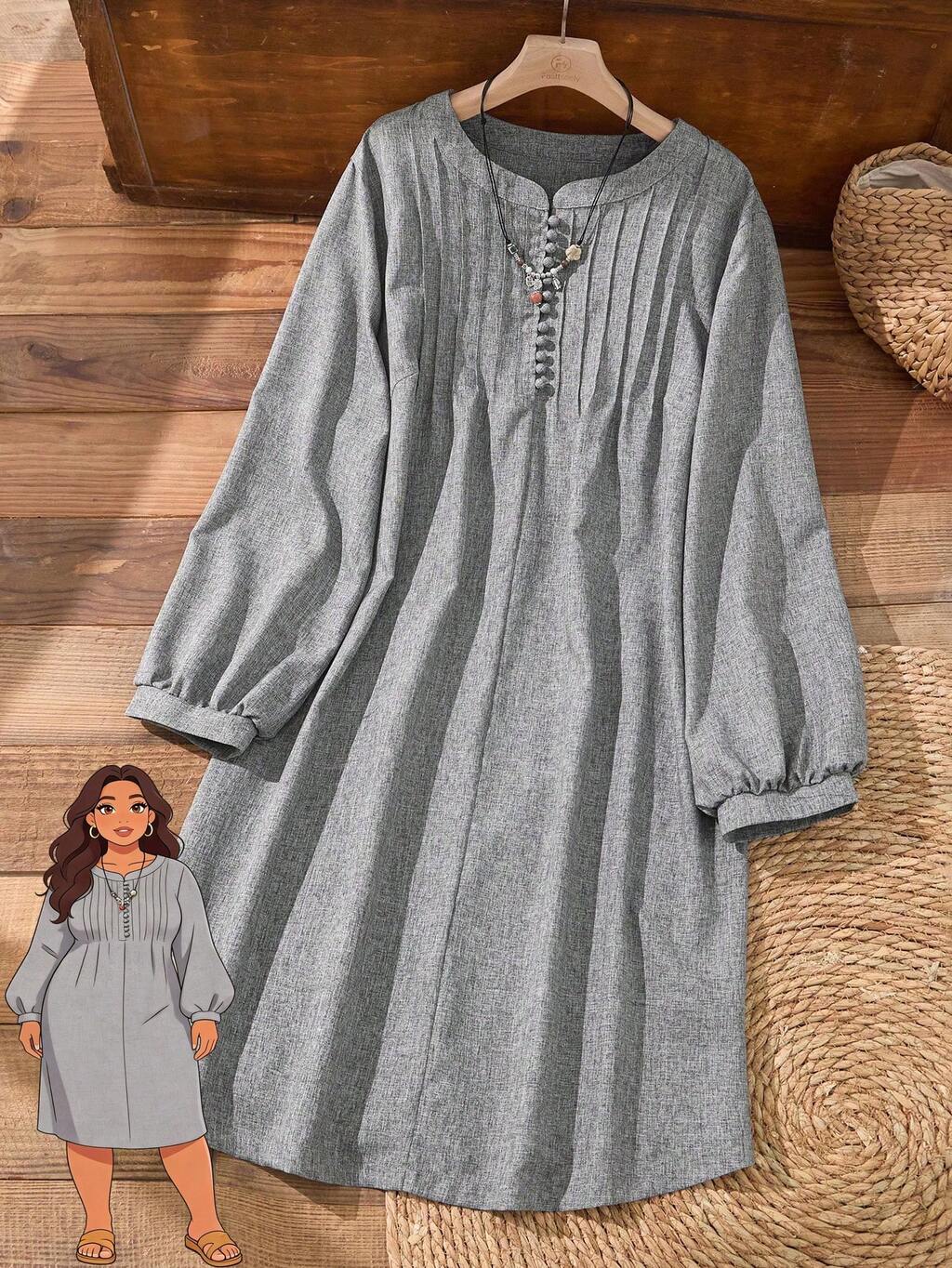Abito casual a maniche lunghe con design plissettato e bottoni davanti, taglia comoda per donna