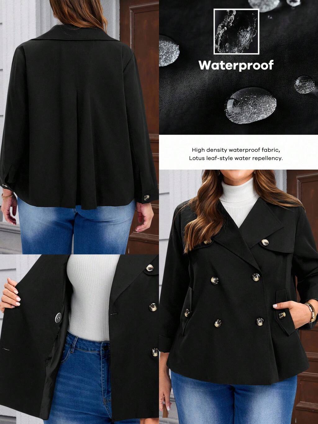 Giacca casual a doppio petto con colletto a bavero, manica lunga, tinta unita, per donne taglie forti, autunno, abbigliamento donna autunnale, giacca nera da donna per l'inverno