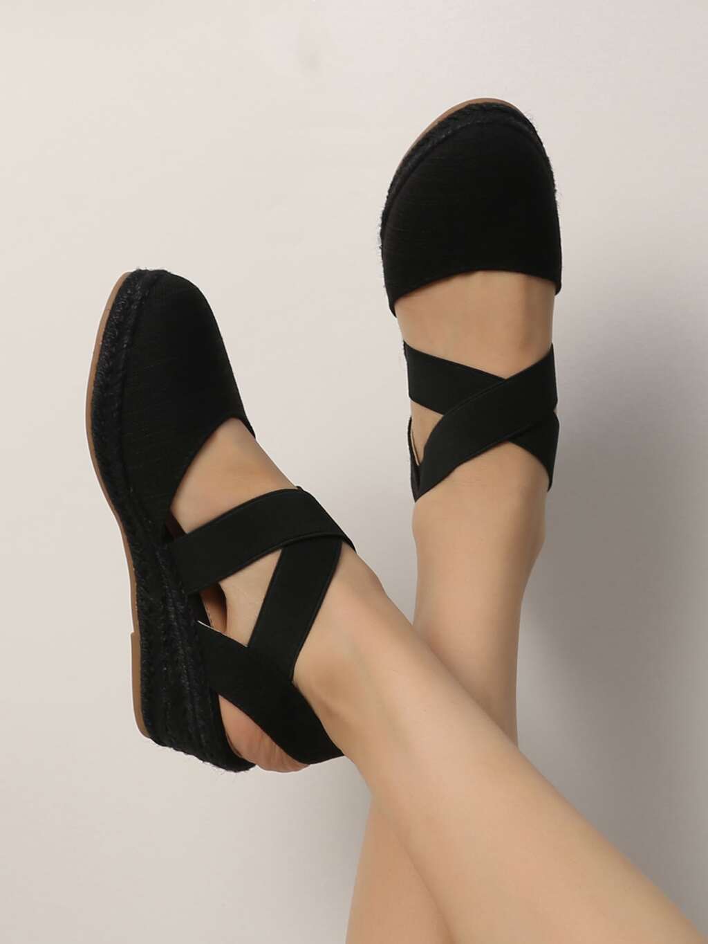ゴムバンド飾り スリップオン ウェッジ ブラック ファッショナブル 単色 女性向け ウェッジ ヒール シューズ