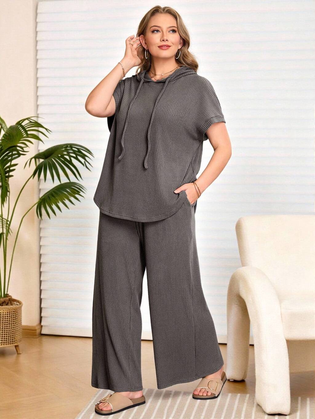 プラスサイズ レディース 無地 半袖 ドローストリング付きパーカーTシャツ とワイドレッグパンツ カジュアル 2点セット