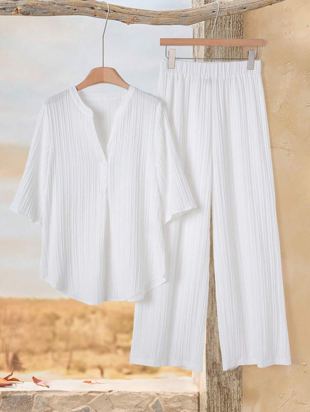 ストライプ柄ノーチェック ネックトップ&伸縮性のあるウエスト ゆったりパンツセット