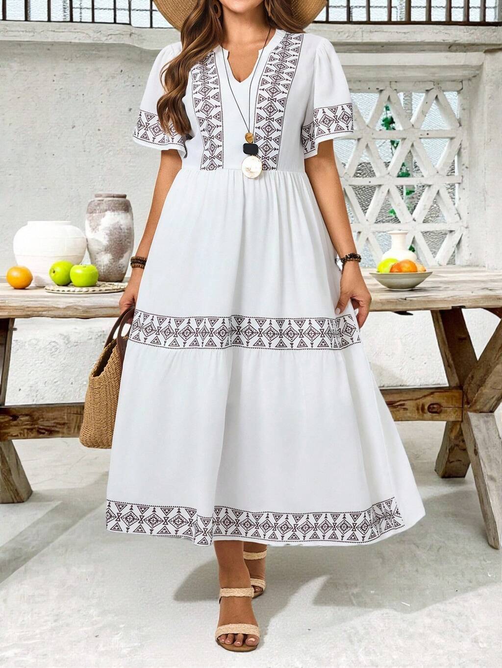 プラスサイズ女性夏幾何学プリントノッチネックバティングショート袖カジュアルブラウス、カントリーカジュアルバケーション女性、シンプルでファッショナブル、毎日着用、夏トップス女性、プラスサイズ夏トップス、母の日ギフト、ボヘミアン、スプリングブレーク、レイブ