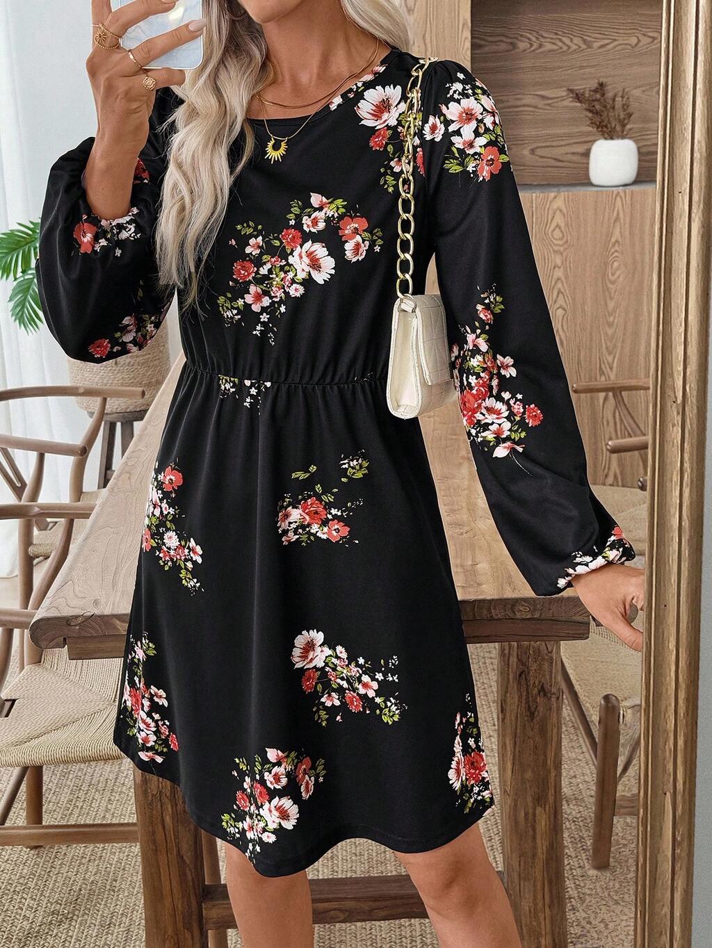 Women's Fashionable French Romantic Print Long Sleeve Mini Dress Black Floral Dress Long Sleeve Floral Dress Lantern Sleeve Dress Black Floral Mini Dress Long Sleeve Summer Dress