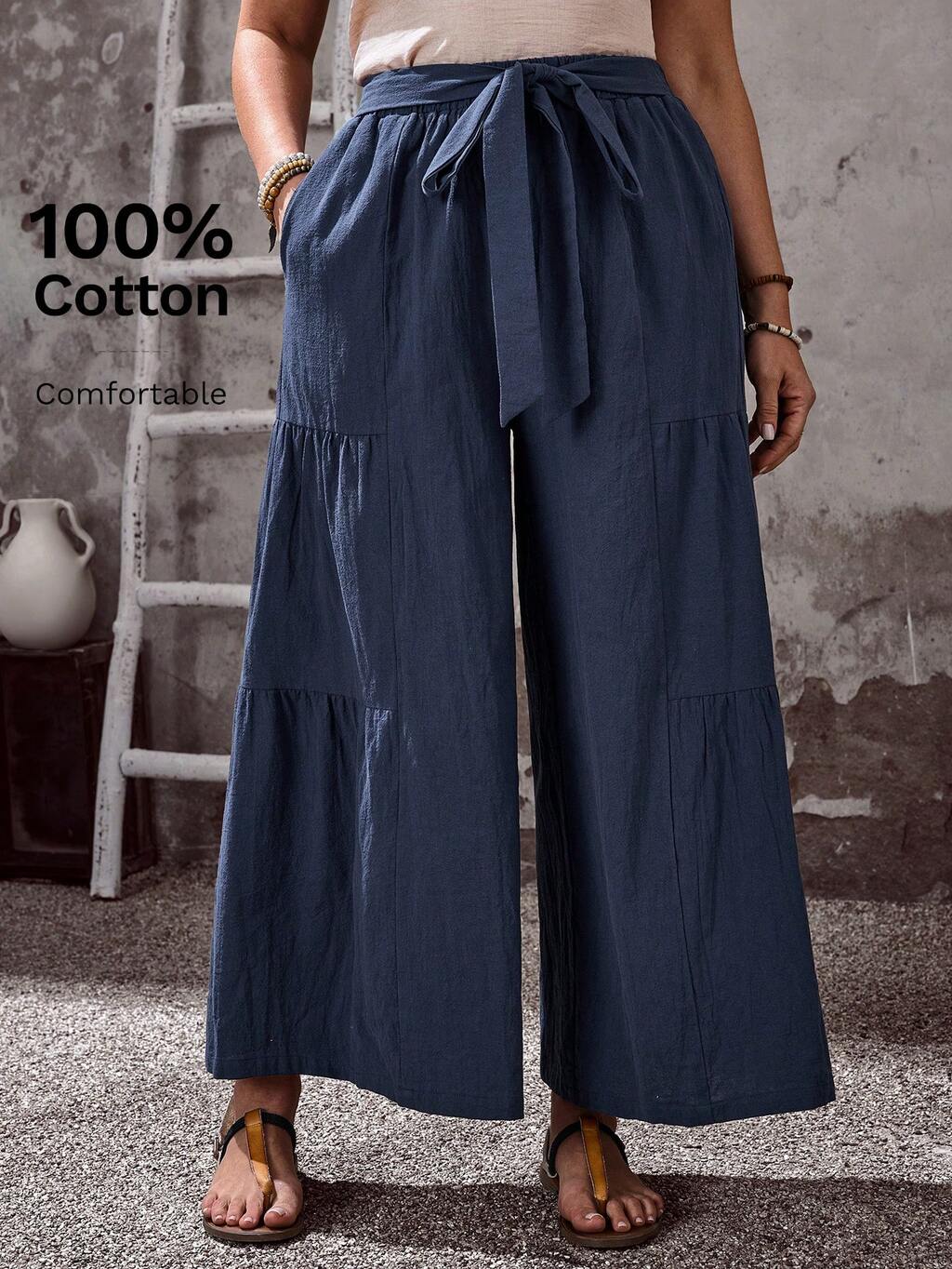 Plus Size Women's Summer Casual Vacation Country Tie-Up Solid Color Navy Blue Wide Leg Pants With Pockets, Summer Holiday,Spring Break Outfits ,Vacation Outfits Women ,Holiday Outfits For Women,Going Out Outfits,2026 New Clothes,Simple And Fashionable For Everyday Wear,Boho Pants For Women, Wide Leg Pants ,Bohemela Pants Wide Leg Summer Pants Women Wide Leg Pants, Loose Pants For Women, Palazzo Pants Women,Suitable For Summer, Vacation, Commute, Daily Wear