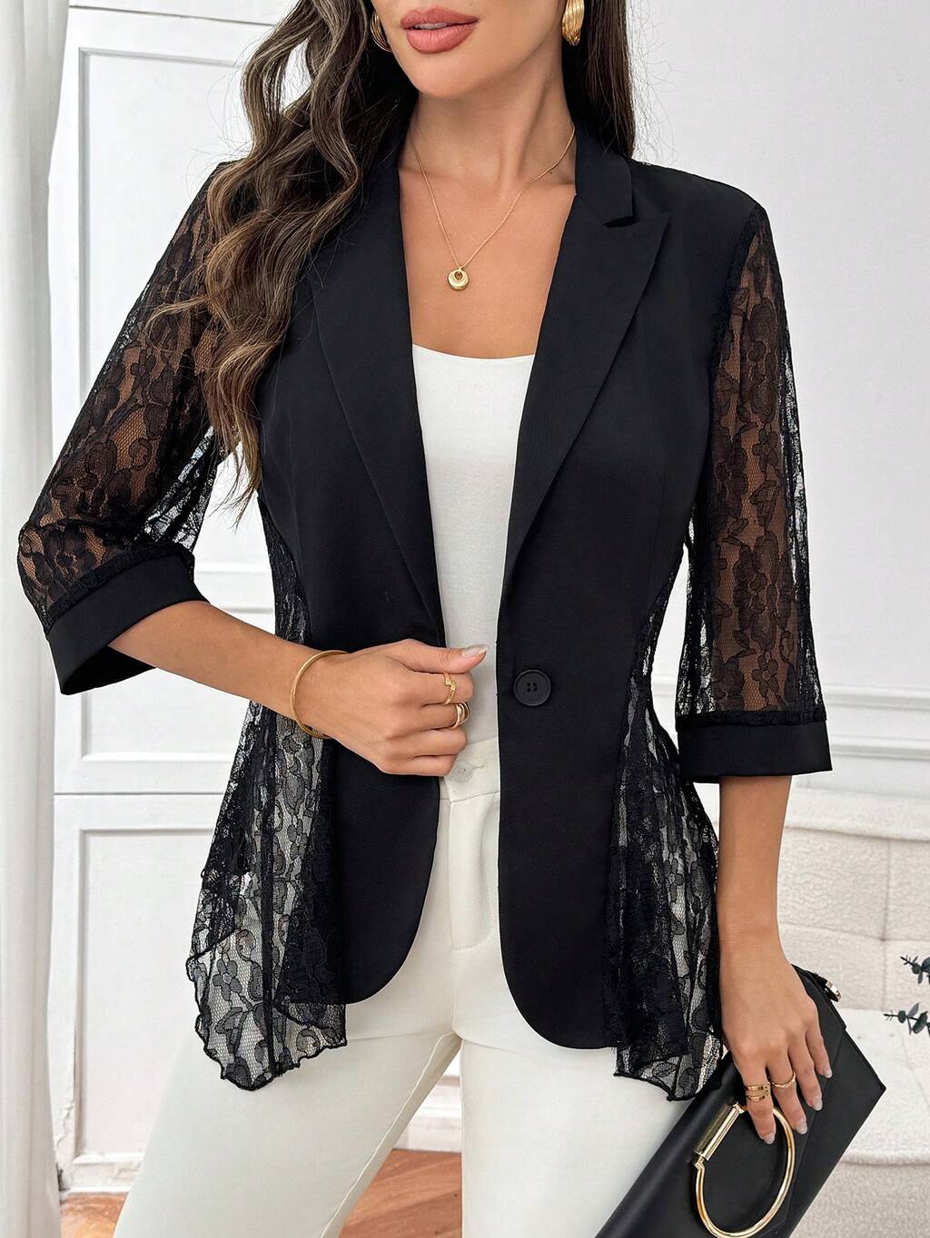Elegant Black Lace Blazer For Women – 3/4 Sleeve Floral Lace Sheer Blazer With Asymmetrical Hem, Perfect For Summer & Spring, Ideal For Wedding Guest, Party, Formal Office, Going Out,Office Outfits For Women,Work Outfits For Women,Graduation Outfit For Mother, Ruffle Blazer,Summer Outfits For Women
