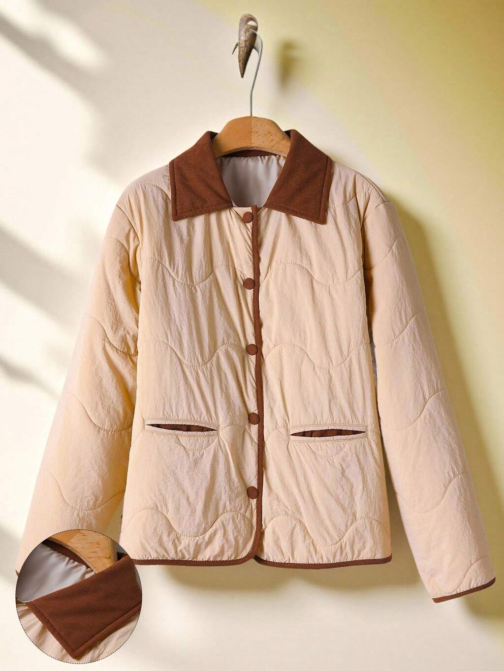 Damski płaszcz jednorzędowy, ciepły, swobodny, pikowany, z kołnierzem w kontrastowym kolorze i długim rękawem