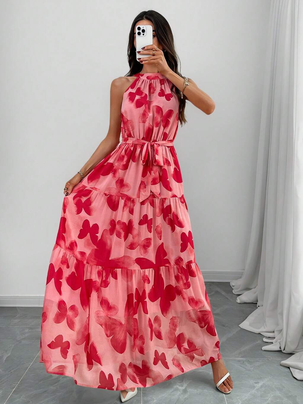 Vestido Halter Elegante Feminino com Estampa de Borboleta, Verão