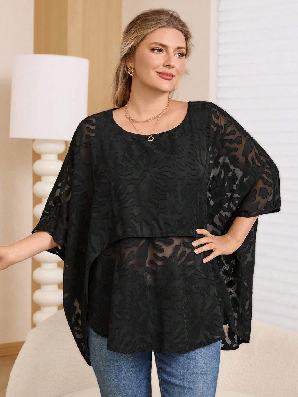 Plus Size Women Summer Vacation Sheer Jacquard Mesh Batwing Sleeve Loose Blouse Valentine's Day Plus Size Black Tops,Flower/Spring