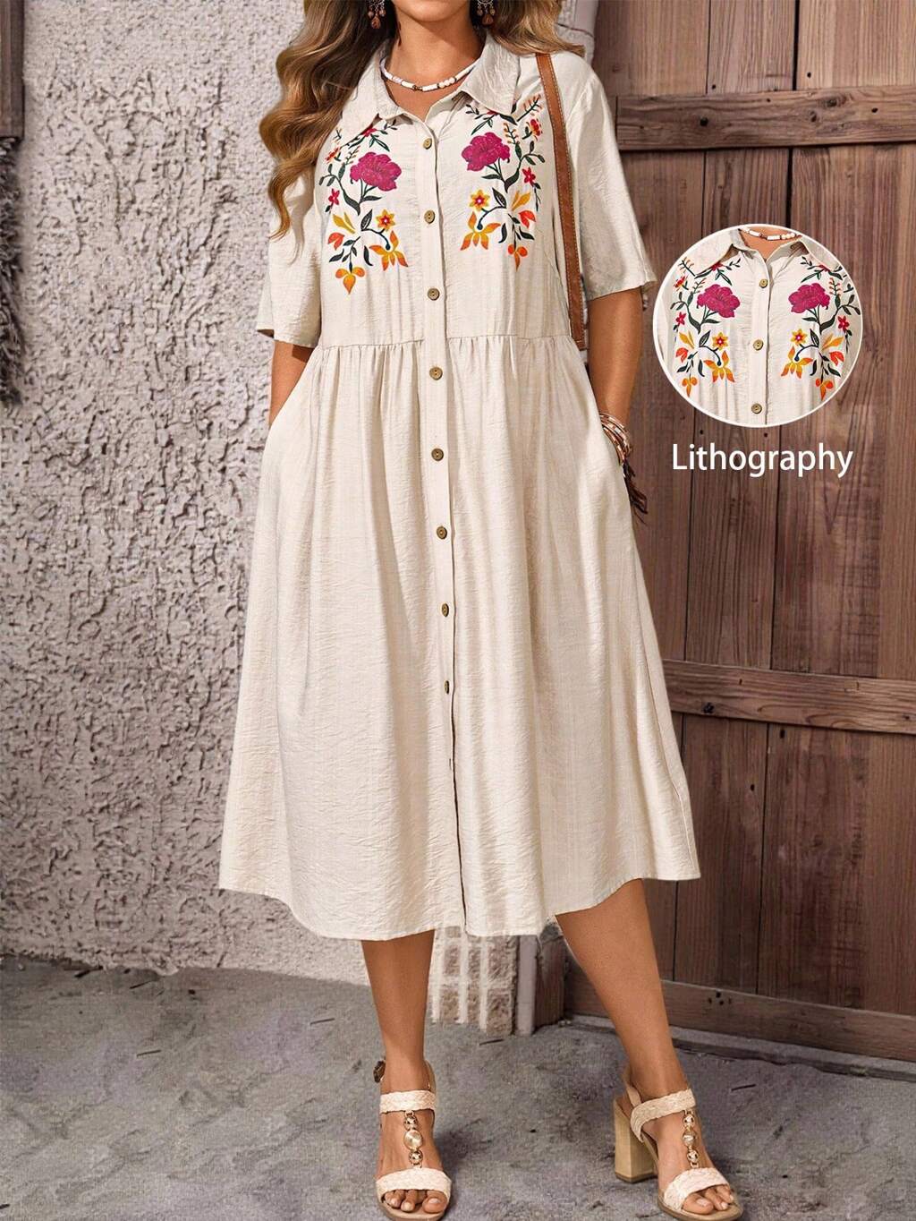 Plus Size Women Fashion Casual Floral Print Button Front Short Sleeve A-Line Dress,Country Casual Vacation Outfits Woman,Simple And Fashionable For Everyday Wear,Summer Tops Women,Summer Outfits For Women,Lithography Dress, Fall Women Clothes,Autumn,Fall Clothes,Flower/Spring