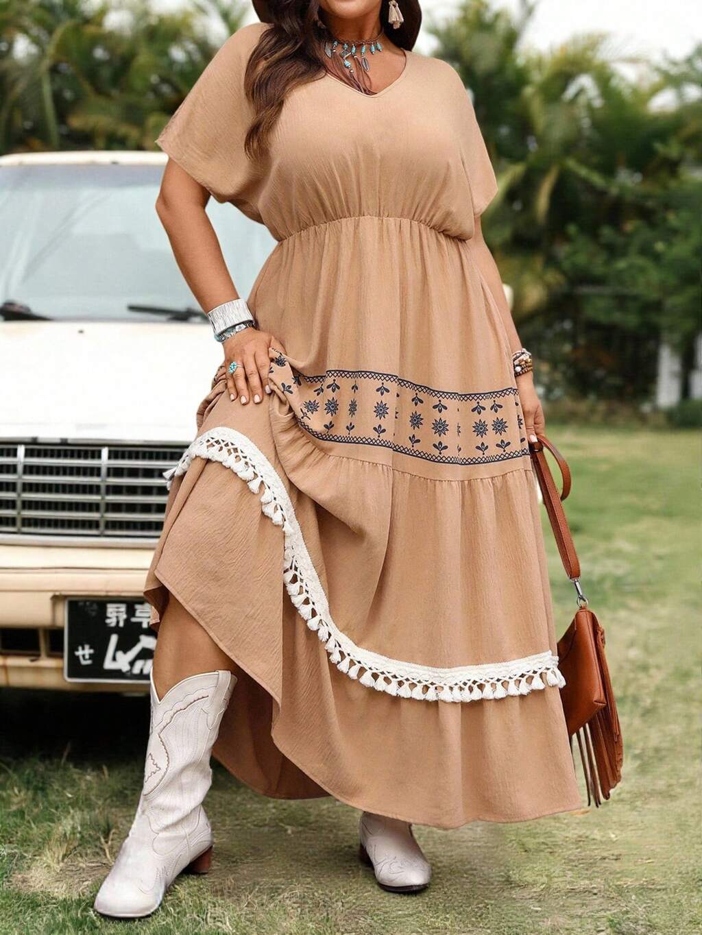 Plus Size Country Boho Vacation Pastoral Comfortable Floral Positioning Flower Lotus Leaf Sleeve V-Neck Fitted Knee-Length Dress Suitable For Spring And Summer Wear Women Plus Sun Dress Women Summer Clothing Vacation Outfits Beach Outfits For Woman Beach Vacation Outfits Beach Dress,Sundress Vacation Dress,Summer Dresses For Women,Dresses Casual