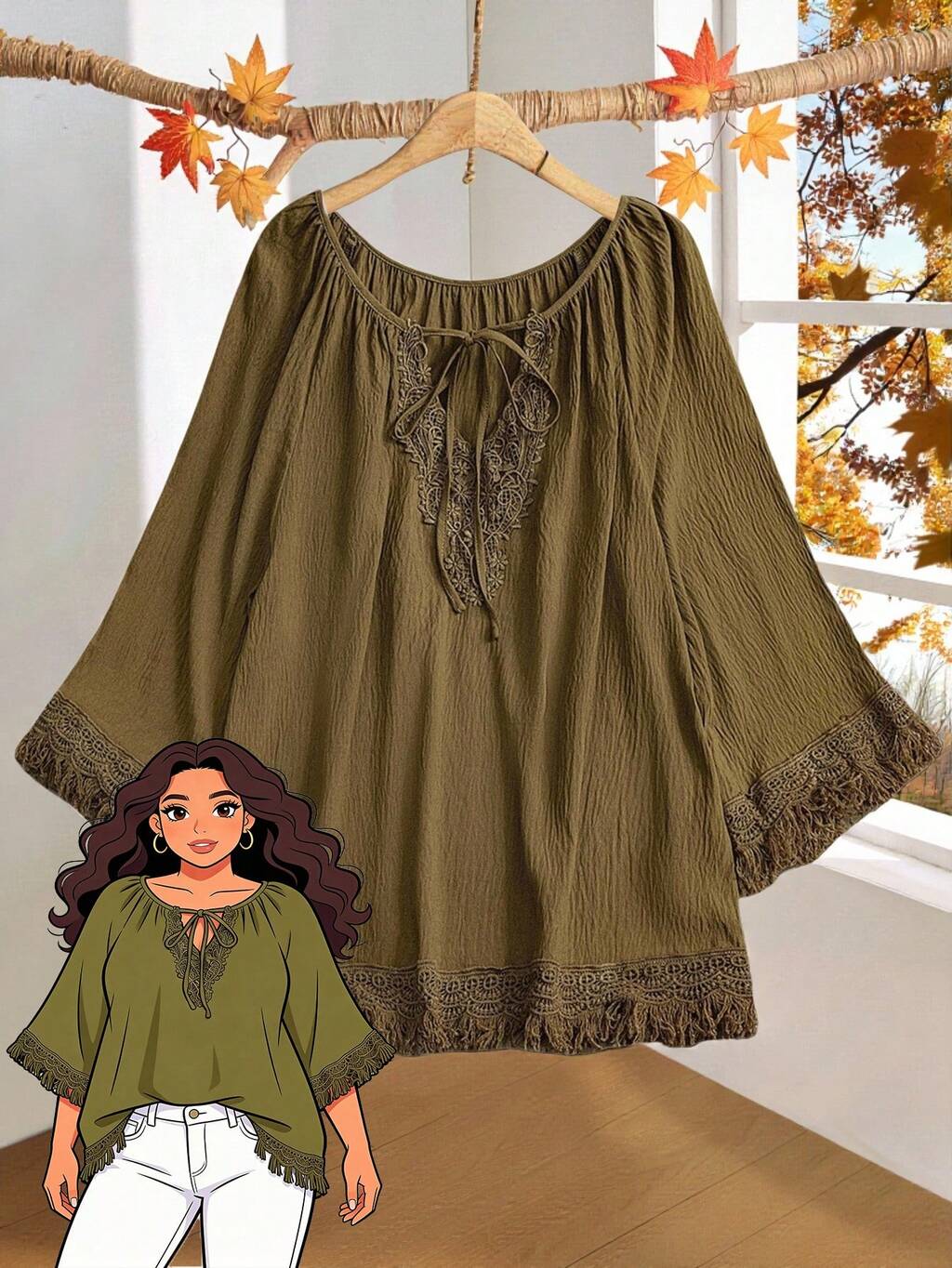 Plus Size Women's Army Green Vintage Country Style Vacation Raglan Sleeve Applique Cutout Tied Cuffs & Hem Fringe Trim Blouse, Suitable For Early Autumn