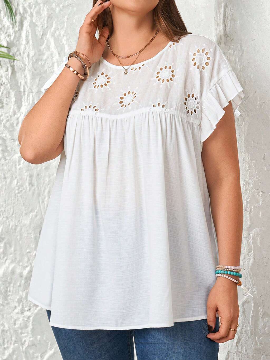 Plus Size Women's Summer Casual Vacation Country Embroidered Patchwork Ruffle Sleeve Round Neck Short Sleeve Solid Color All White Blouse Top Shirt,Summer\Vacation,Summer Holiday,Spring Break Outfits ,Vacation Outfits Women ,Holiday Outfits For Women,Going Out Outfits,2026 New Clothes,Simple And Fashionable For Everyday Wear,Suitable For Summer, Vacation, Daily Wear