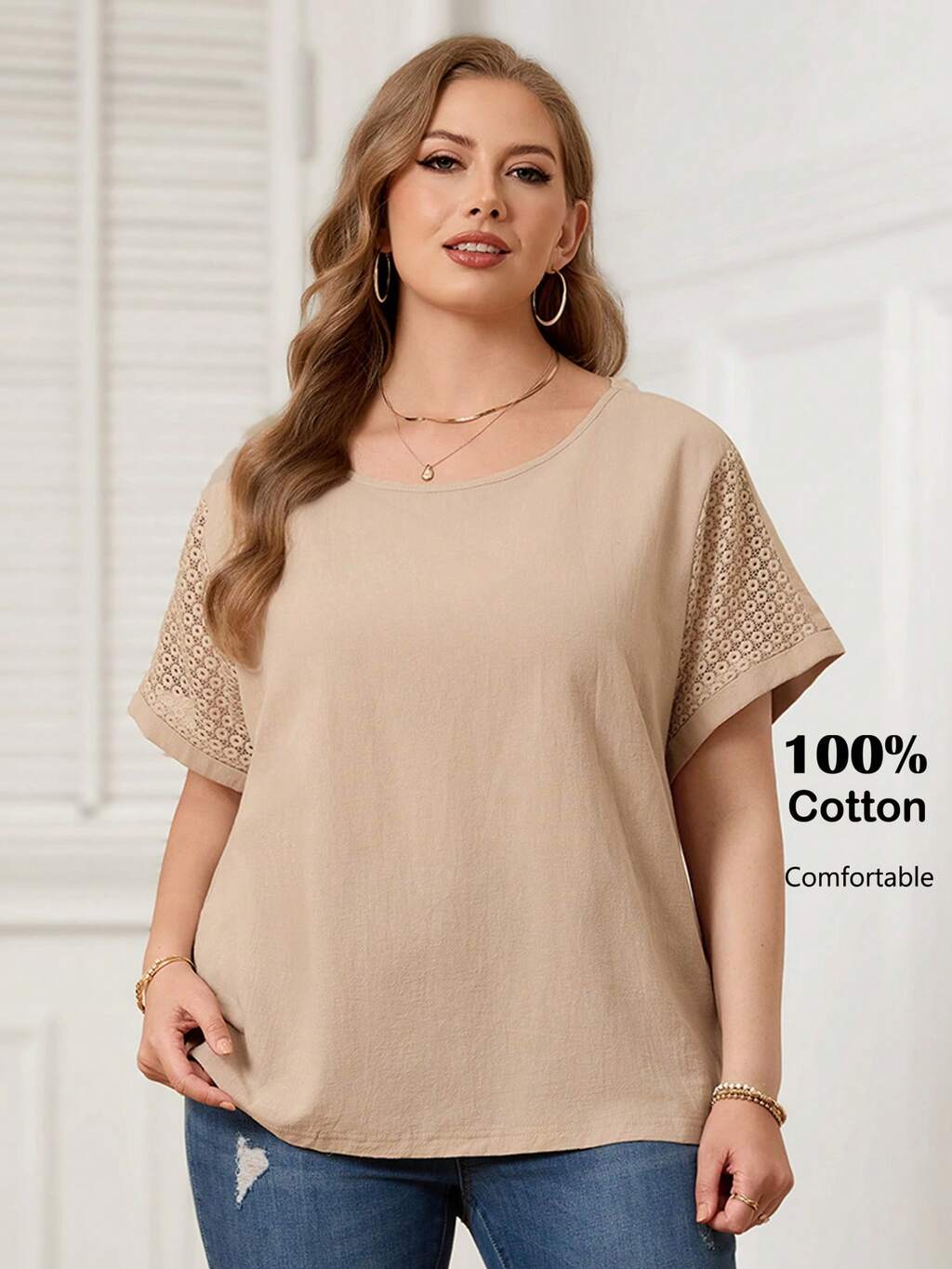 Plus Size Women's Summer Casual Vacation Country Spring Solid Color Khaki Lace Patchwork Round Neck Short Sleeve Blouse,Comfortable And Breathable,Summer Holiday,Spring Break,Vacation,Holiday,Going Out,2026 New,Simple And Fashionable For Everyday Wear,Casual Vacation Boho Top, Casual Tops,Suitable For Summer, Vacation, Commute, Daily Wear