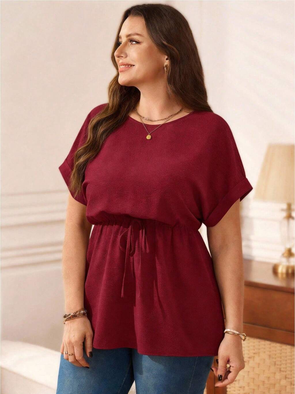 Plus Size Women's Summer Casual Vacation Solid Color Textured Short Sleeve Blouse, Summer,Early Spring Break,Vacation,Holiday,Spring,Going Out,2026 New,Simple And Fashionable For Everyday Wear, Babydoll Tops For Women Elegant, Wine Red Top
