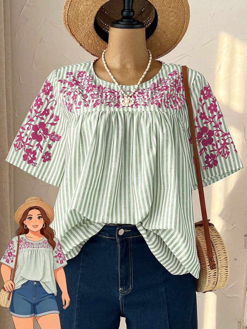 Plus Size Women Spring Casual Vacation Short Sleeve Striped Floral Print Blouse,Plus Size Women's Summer Casual Vacation Country Spring Round Neck Short Sleeve Green Striped Floral Print Blouse,Spring Break,Vacation,Holiday,Going Out,2026 New,Simple And Fashionable For Everyday Wear,Casual Vacation Boho Top, Smock Top, Striped Blouse, Boho Chic Top,Suitable For Summer, Vacation, Commute, Daily Wear, Going Out Tops,Gifts For Mother