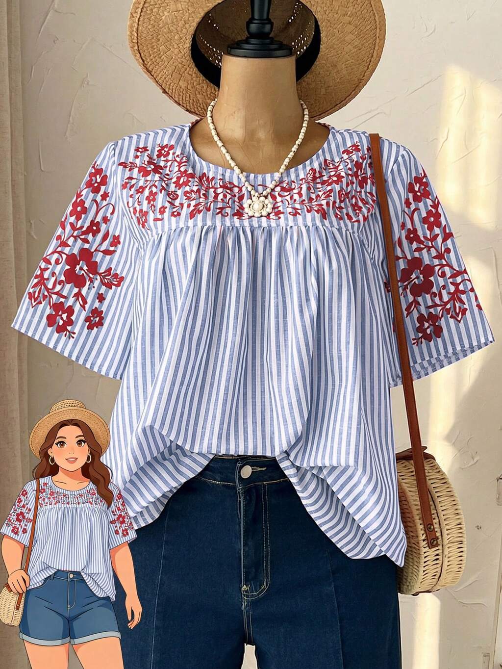 Plus Size Women Spring Casual Vacation Short Sleeve Striped Floral Print Blouse,Plus Size Women's Summer Casual Vacation Country Spring Round Neck Short Sleeve Blue Striped Floral Print Blouse,Spring Break,Vacation,Holiday,Going Out,2026 New,Simple And Fashionable For Everyday Wear,Casual Vacation Boho Top, Smock Top, Striped Blouse, Boho Chic Top,Suitable For Summer, Vacation, Commute, Daily Wear, Going Out Tops,Gifts For Mother