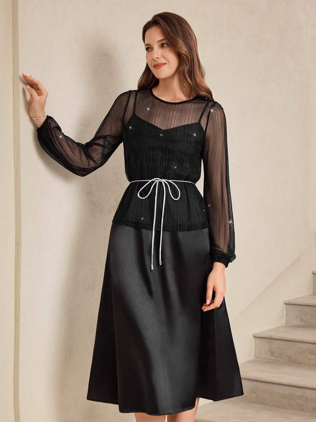This Elegant Women's Dress Features A Classic Pure Black Base. The Sheer Fabric Of The Bodice Is Adorned With Delicate Shimmering Silver Threads, Creating A Textured Contrast With The Matte Satin Skirt, Exuding A Subtly Luxurious Feel. The Floral Pattern Is A Minimalist Solid Color Design, Understated Yet Sophisticated. The Silhouette Consists Of A Sheer Long-Sleeved Top, A Belted Waist, And A Flowing Satin Skirt. The Lightweight Fabric Is Versatile Enough For Various Occasions, Showcasing Elegant Style. Perfect For Summer, It's Suitable For Evening Events, Casual Gatherings, Or Romantic Dates. The Pure Black Base Conveys A Sense Of Sophistication, While The Combination Of Sheer Fabric And Satin Showcases Fashionable Taste. It's A Versatile And Stylish Choice For Your Summer Wardrobe.,Summer Outfits
