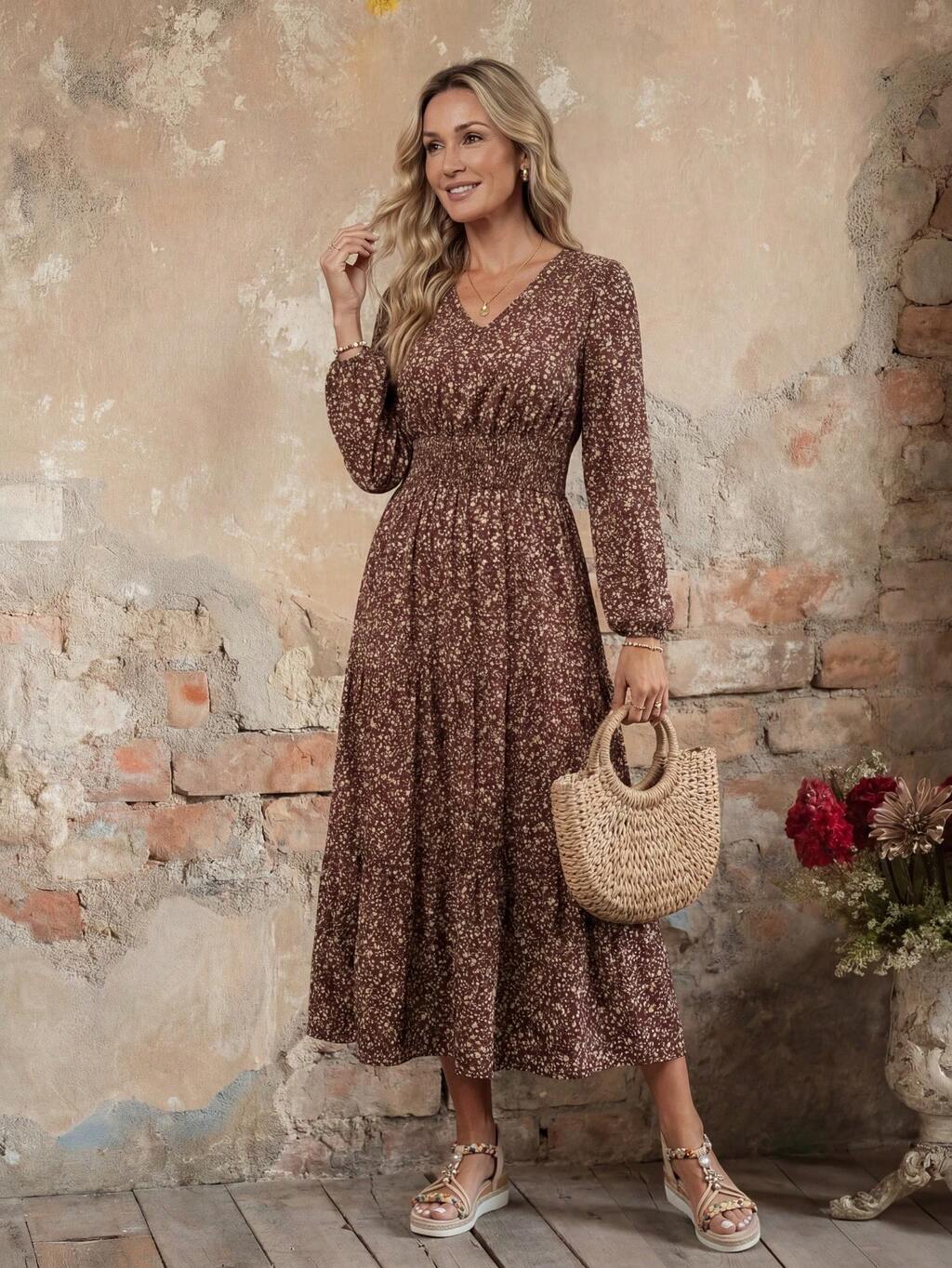 Women's Casual Floral Print Long Sleeve Dress, Suitable For Autumn/Winter Everyday Wear Winter Dress Elegant Dresses For Women Floral Dress For Women Elegant Midi Dress Autumn Dress Earth Tone Dress Fall Dresses For Women Women Outfit Date Night Going Out Dress