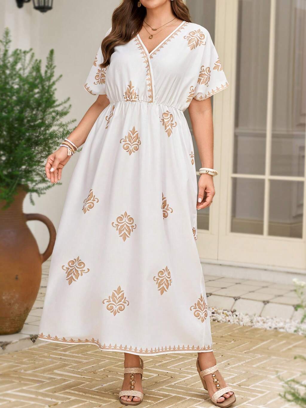 Women's Plus Size White Embroidered Bohemian Dress V-Neck Dolman Sleeve Maxi Length Perfect For Summer Resorts Summer Outfit For Plus Size Women Festival Outfits For Plus Size Women Beach Outfits For Plus Size Women Vacation Outfits Plus Size Women Country Concert Outfit Boho Outfit